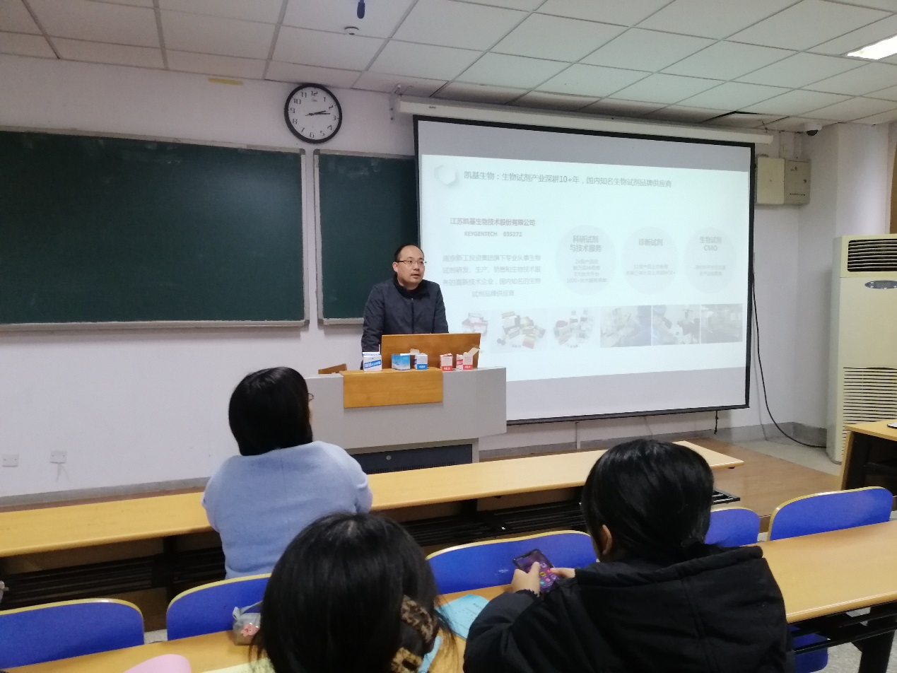 11月24日下午,食品科学学院举办了创新创业课程系列讲座,江苏凯基生物有限公司研发部负责人张峰博士受邀以“知识、能力、技能”为主题作了分享,2020级全体新生聆听了讲座。